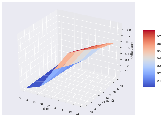 Of course, we cannot visualize Greek surfaces dependent on initial values for all four risk factors but still for two. In what follows we generate the delta surfaces with respect to the jump diffusion- and stochastic volatility-based risk factors.
