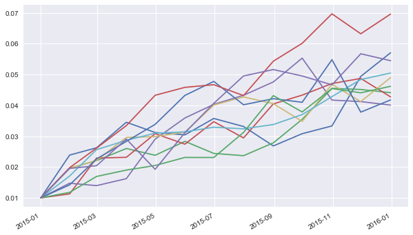 plt.plot(ssr.process.time_grid, ssr.process.get_instrument_values()[:, :10]);